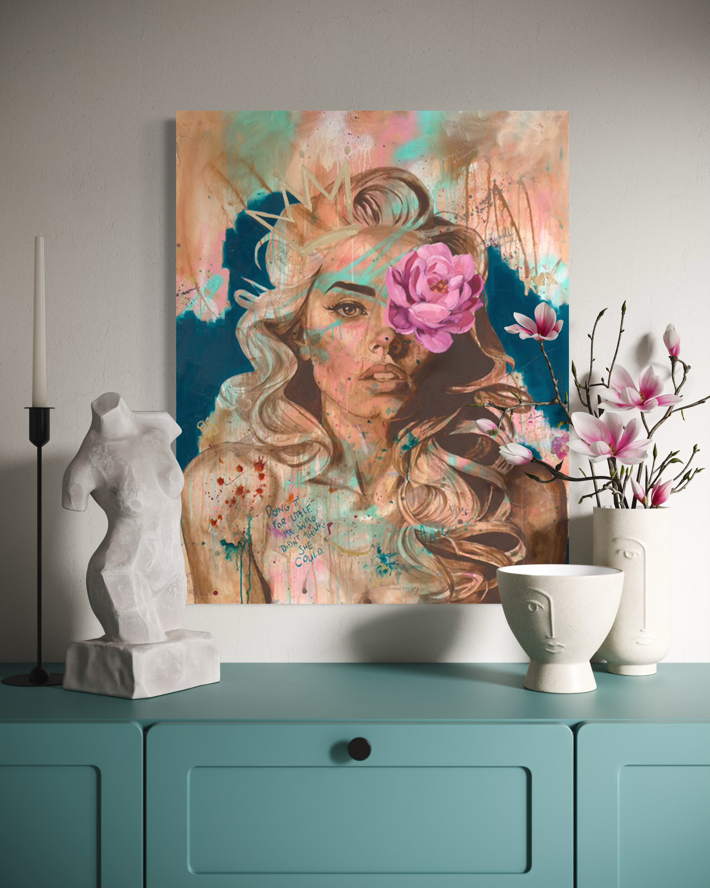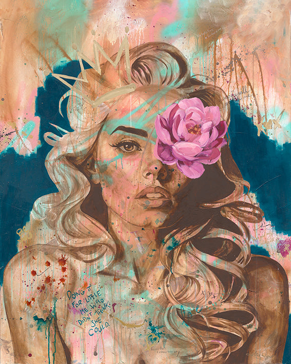 To me the flower covering one eye represents “Grow through what you go through.”  There is symbolism in each flower from Magnolia for pride & dignity to the Peony representing love, honour and happiness. The theory is called extraction, where covering an important part of a piece allows the viewer to create their own interpretation of the piece. I absolutely love that my art can resonate differently for so many people. I also just looove flowers 😉